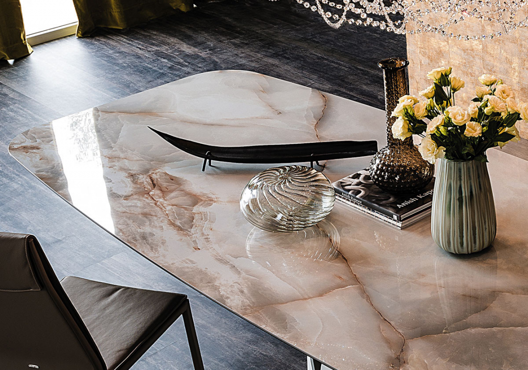 Раздвижной стол с базой из металла, окрашенного в брашированную бронзу. Топ и раздвижные элементы из керамики под мрамор цвета глянцевая Breccia.