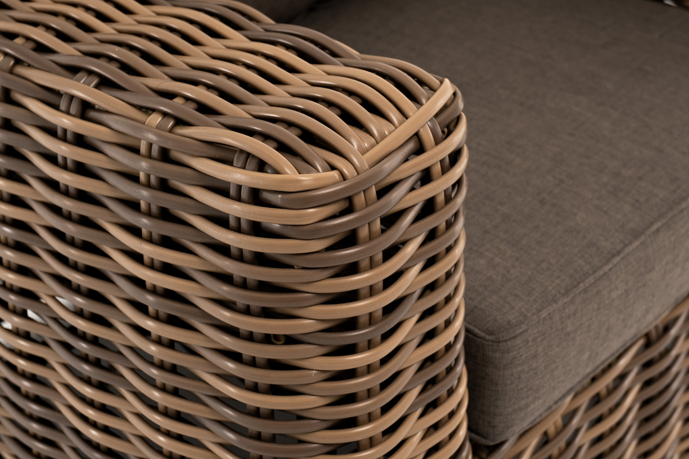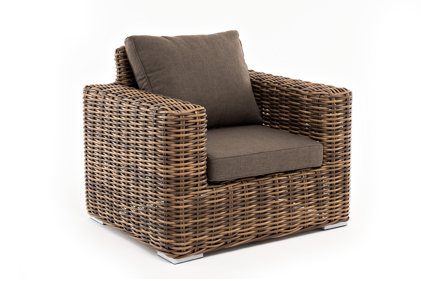 Кресло оснащено каркасом из прочного алюминия, ручное круглое плетение является основным декоративным элементом мебели. Оно выполнено из искусственного ротанга в соломенном цвете.