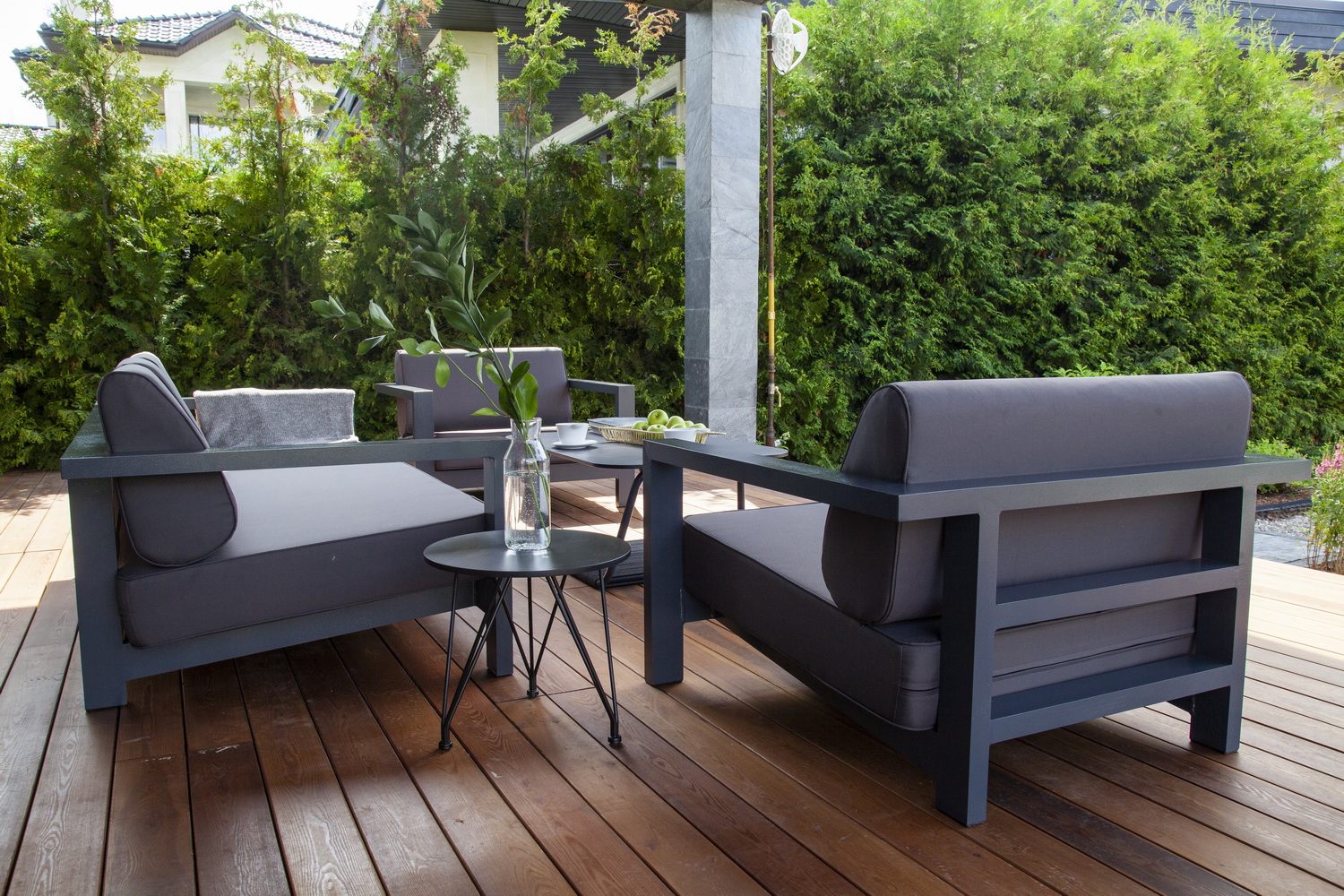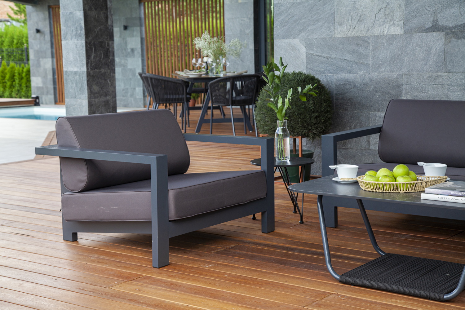 Стильное кресло «Гранада» для создания зоны отдыха. Каркас выполнен из высокопрочного легкого алюминия темно-серого (RAL7024) цвета. На сидениях и спинке предусмотрены подушки темно-серого оттенка.