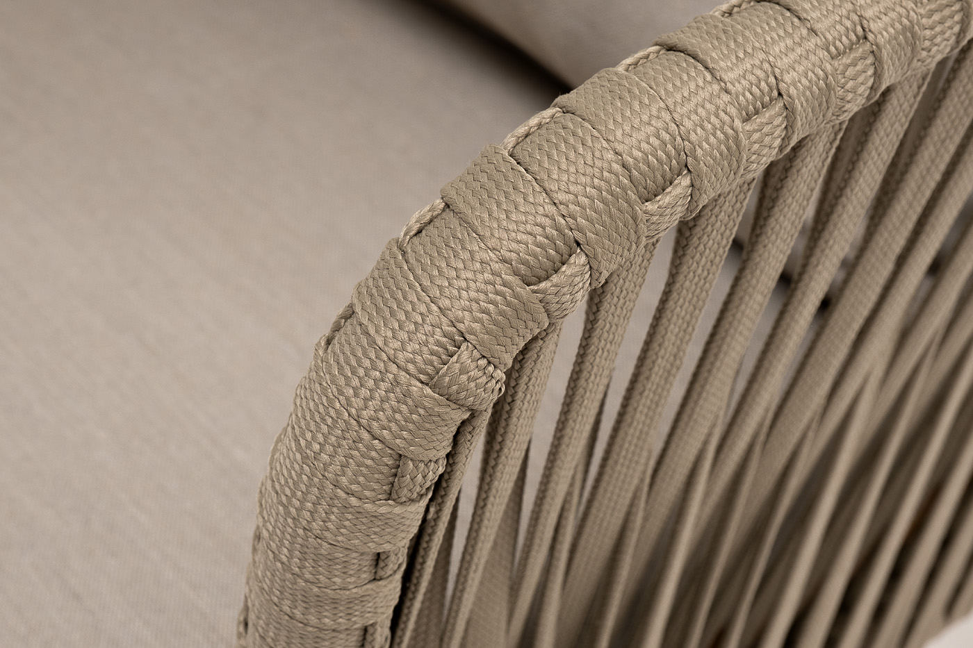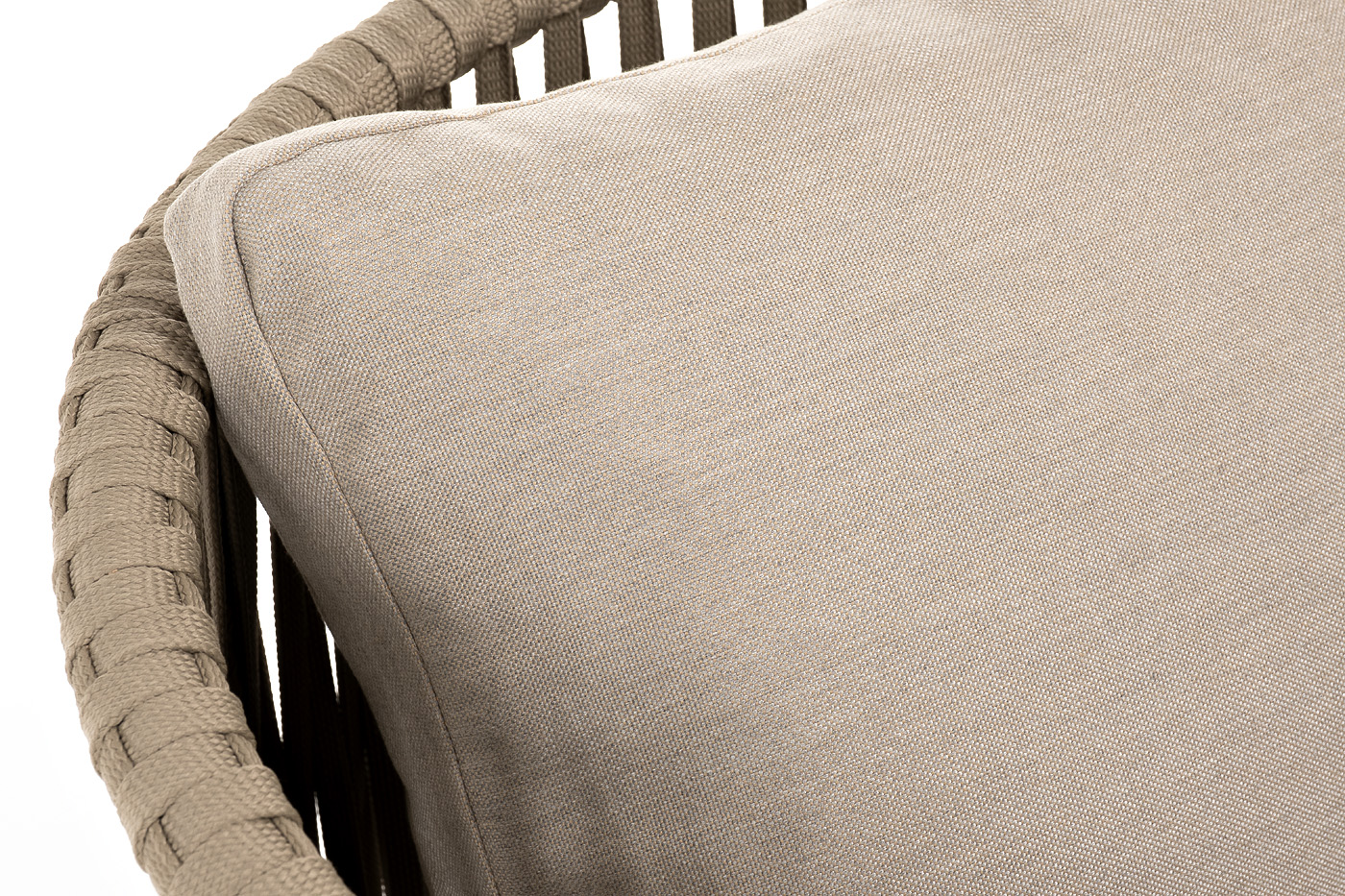 "Мальорка" кресло плетеное из роупа, основание дуб, роуп серо-коричневый 23мм, ткань бежевая 052