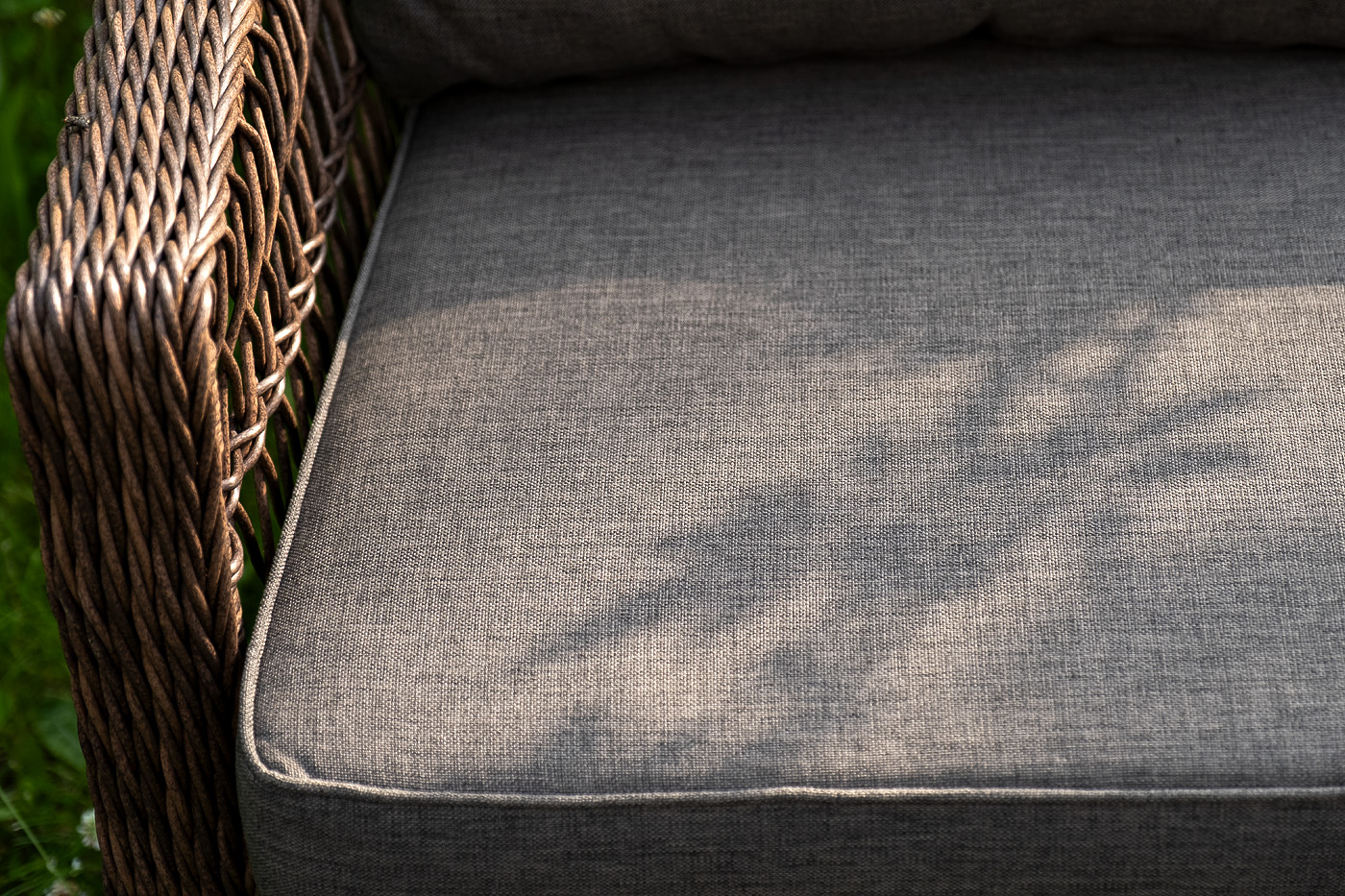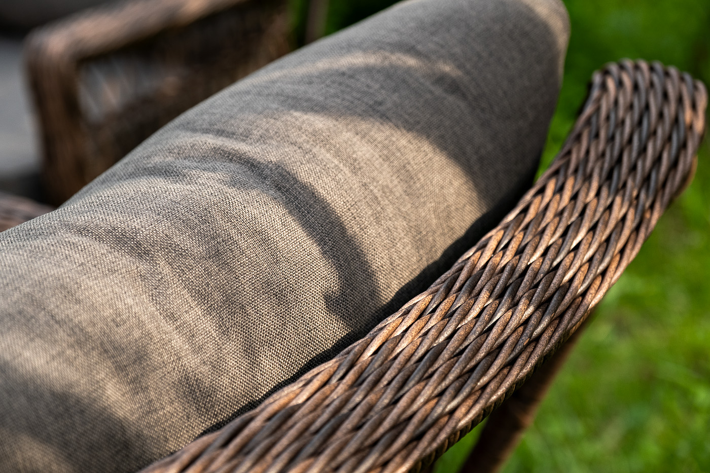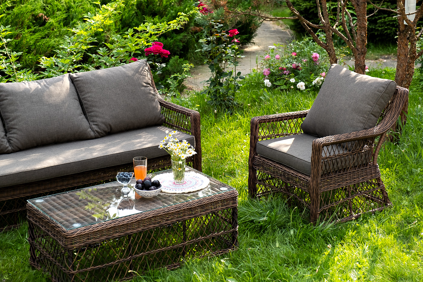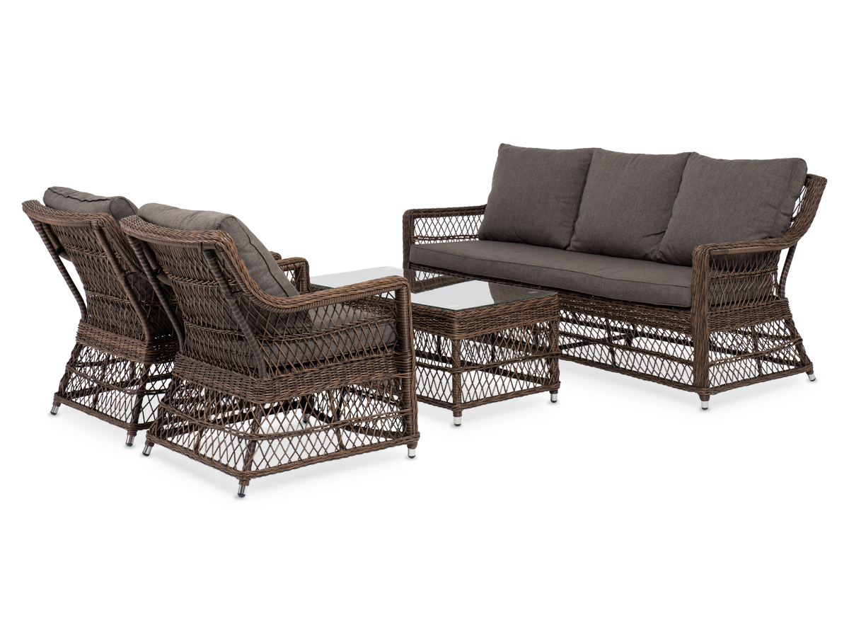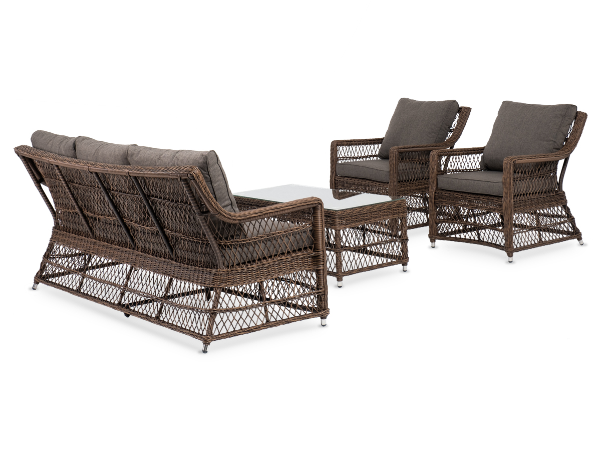 Уличная мебель имеет алюминиевый каркас, ручное плетение, сделанное из коричневого искусственного ротанга. Предусмотрены мягкие подушки из полиэстера серо-коричневого цвета с плотностью 230гр/м2. Они имеет влагоотталкивающую пропитку. Рабочая поверхность столика изготовлена из закаленного стекла толщиной 5 мм.