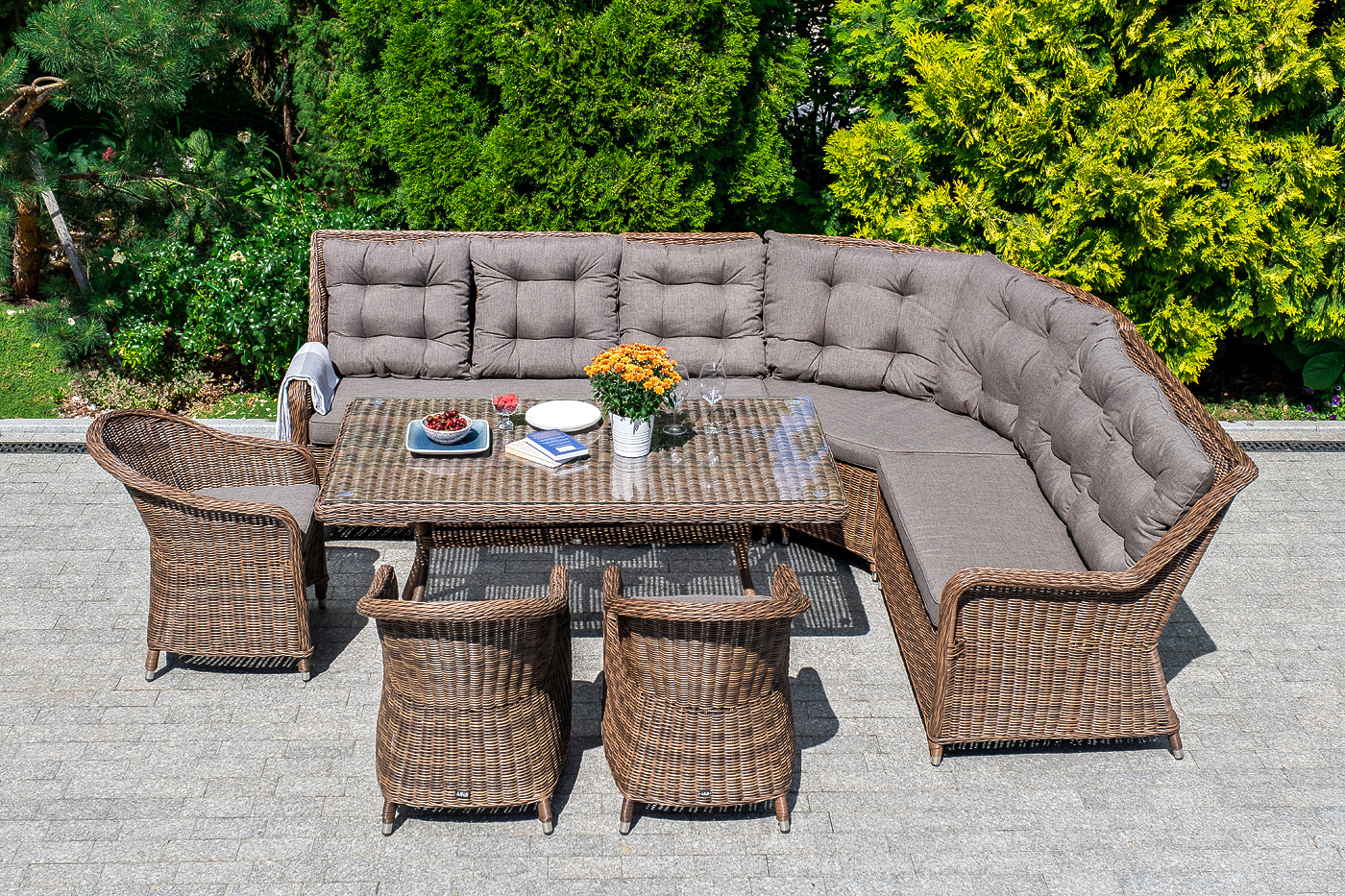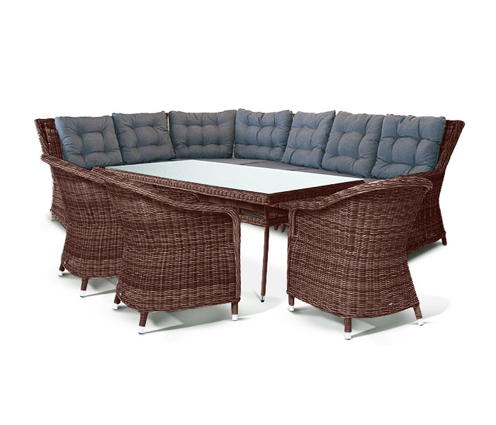 Угловая модульная лаунж-зона с обеденным столом и тремя стульями. Искусственный ротанг, плетение круглое, цвет коричневый, алюминиевый каркас. Столешница из закаленого стекла 5 мм.