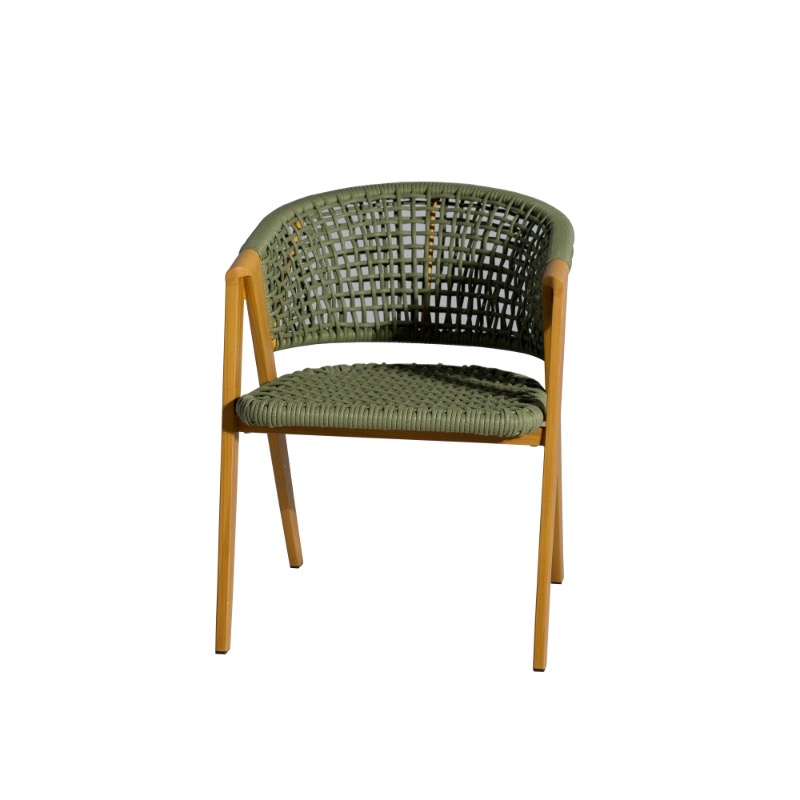 Изготовлен из алюминиевого каркаса, оплетенного вручную эластичными синтетическими лентами из высокопрочных полиэфирных волокон. Роуп является гипоаллергенным, прочным, износостойким и устойчивым к ультрафиолету. Приятный на ощупь и напоминает шерстяное плетение. Цвет каркаса – «под дерево», оплетки - зеленый. На ножках стула идут черные пластиковые наконечники (заглушки).